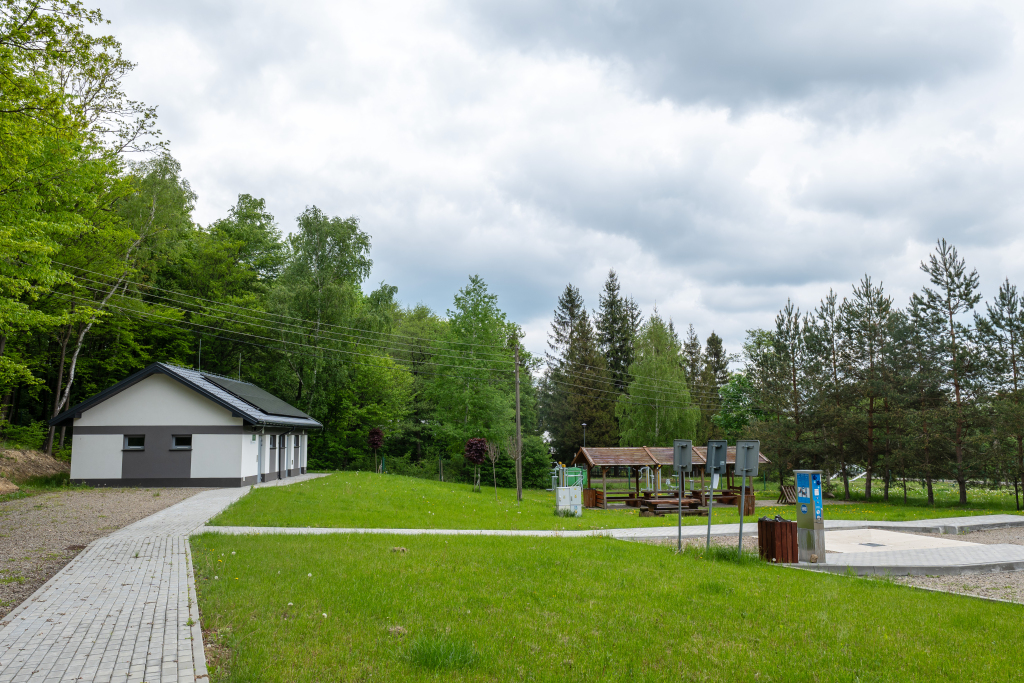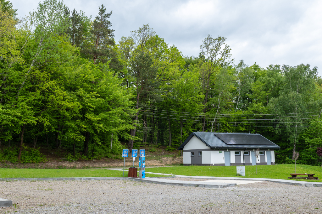 Parking został zaprojektowany z myślą o komforcie użytkowników kamperów i przyczep kempingowych. Na jego terenie znajdują się wyznaczone stanowiska postojowe oraz kolumna serwisowa umożliwiająca pobór wody, energii elektrycznej i zrzut ścieków. Do dyspozycji gości jest także zaplecze sanitarne z łazienkami i toaletami, a także przestrzeń pomocnicza do przygotowywania posiłków.